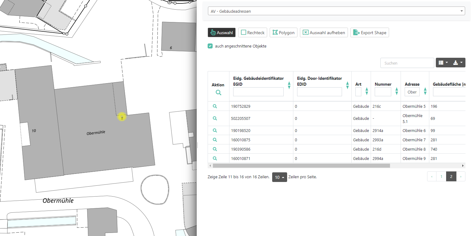 Bei den Tabellen sind neu auch die Einträge AV – Gebäudeadressen und AV – Liegenschaften zu finden. Diese ermöglichen es, innert kürzester Zeit Adressen und Liegenschaften in der / den betroffenen Gemeinde(n) abzufragen. Natürlich könnt Ihr wie gewohnt auch die räumlichen Auswahlfunktionen der Tabellen nutzen. Bei der Suche kann neu auch nach dem eidgenössischen Gebäudeidentifikator (EGID) gesucht werden.