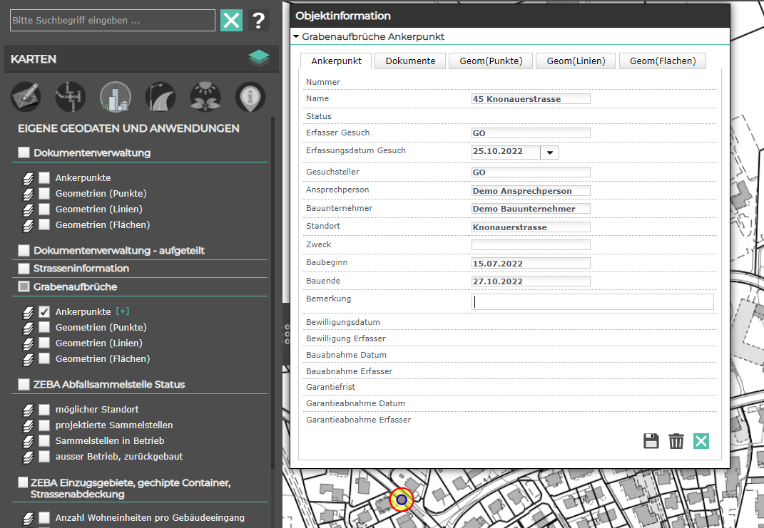Mithilfe des Moduls Grabenaufbrüche können Gesuche für Grabenaufbrüche im Gemeindegebiet einfach und selbständig erfasst und nachverfolgt werden. Bei Einreichung des Gesuchs wird dieses mit einem Ankerpunkt erfasst und bei Bedarf mit Dokumenten und Flächengeometrien ergänzt. Der Stand des Gesuchs von der Erteilung der Bewilligung über den Bauabschluss bis zur Garantieabnahme wird über eine Checkliste nachgeführt. Bei Bedarf kann die zuständige Stelle über den baldigen Ablauf der Garantiefrist erinnert werden. Jederzeit können weitere Dokumente (z.B. Notizen, Skizzen, etc.) ergänzt werden.