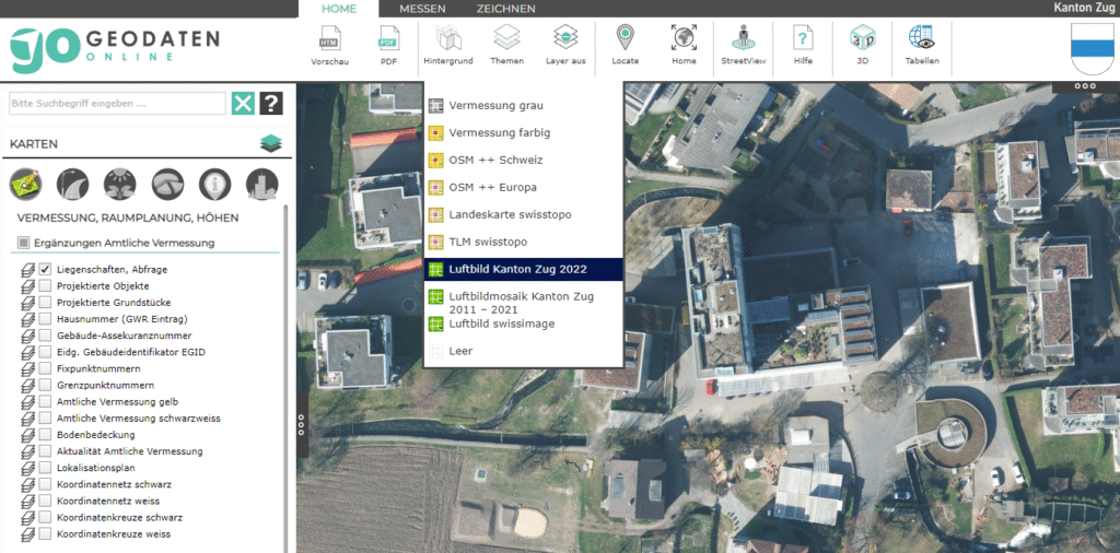 Neu kann das Orthophoto 2022 des Kantons Zug im GO als Basiskarte verwendet werden. Erstmals seit 2011 hat der Kanton Zug im Frühjahr 2022 wieder ein flächendeckendes Luftbild über den ganzen Kanton mit einer Auflösung von 5 cm / Pixel erstellt. Es ist optimal geeignet als Hintergrundkarte für eine Vielzahl an Anwendungsfällen. Die in den Zwischenjahren erstellten, nur einzelne Gemeinden umfassenden Luftbilder von 2011 – 2021 sind in einem zusammengesetzten Mosaik ebenfalls als Hintergrundkarte verfügbar. Noch ältere Luftbilder des Kantons Zug oder anderer Organisationen können bei Bedarf als Karten hinzugefügt werden.