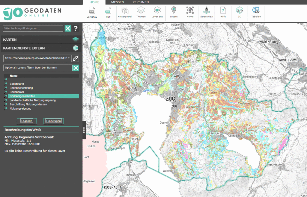 Das Bild zeigt das Beispiel des Layers „Bodeneigenschaften“ der Zuger Bodenkarte:
