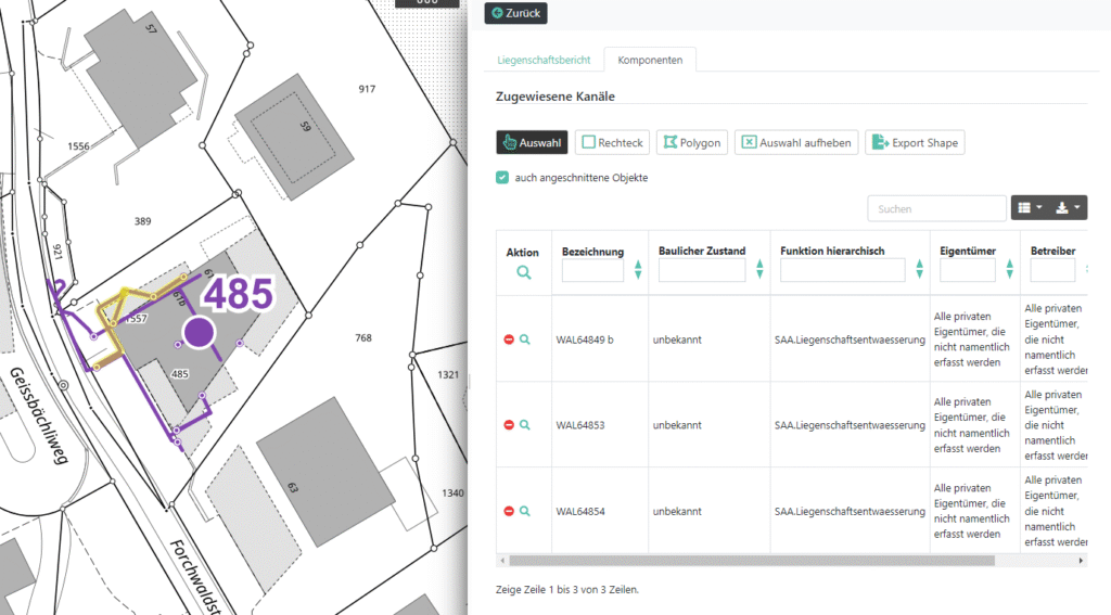 Dank einer der neusten GO-Entwicklungen ist es nun möglich, die räumlichen Filterfunktionen, welche Ihr aus den Tabellen kennt, auch in den Subtabellen der Formulare zu nutzen, welche in vielen Anwendungen integriert sind. Die Funktionalität beinhaltet wie gewohnt eine Einzelauswahl sowie die Selektion über ein Rechteck oder ein Freihand-Polygon. Zusätzlich ist auch der Export der ausgewählten Objekte als Shape für Euch vorbereitet.